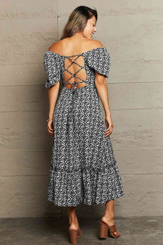 HEYSON Heart Mesh Flare Sleeve Midi Dress